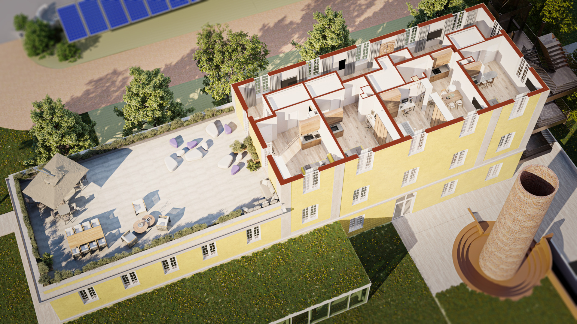 In corrispondenza del magazzino demaniale, a est degli edifici residenziali verrà realizzata una palestra co copertura verde (indicato con la lettera D) con accesso verso l’esterno per poter praticare attività sportive anche all’aperto. L’intero progetto si pone nell’ottica di una progettazione sostenibile, valorizzando l’utilizzo di energie alternative (pannelli fotovoltaici, inseguitori, ecc.), e materiali innovativi, riducendo al minimo i consumi energetici.