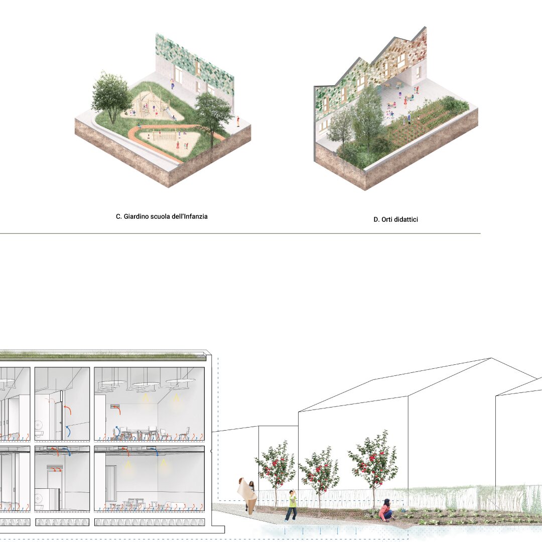 Particular attention was paid to the organization of green areas and outdoor spaces, as resources for educational action and learning, and to the study of natural materials for flooring.