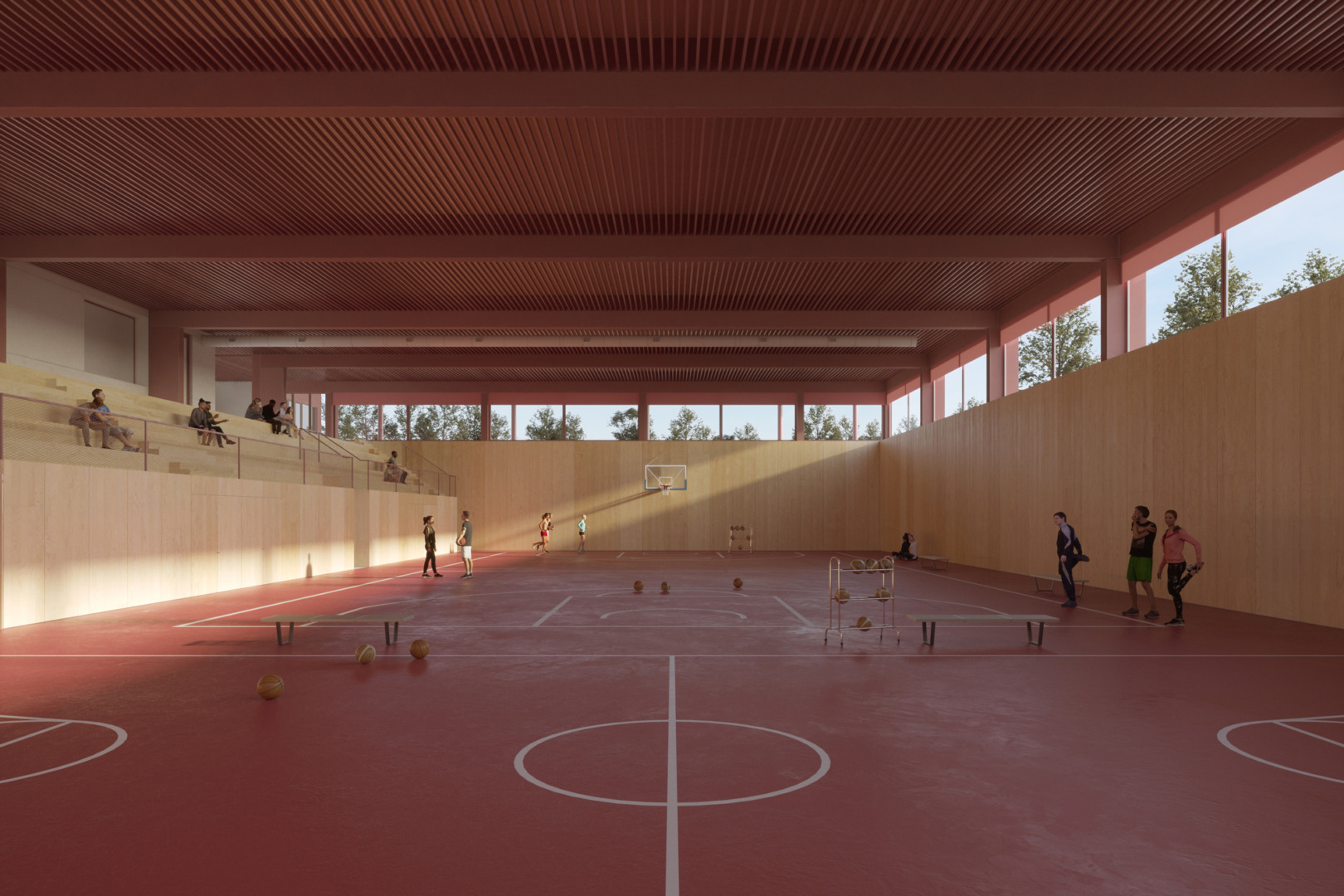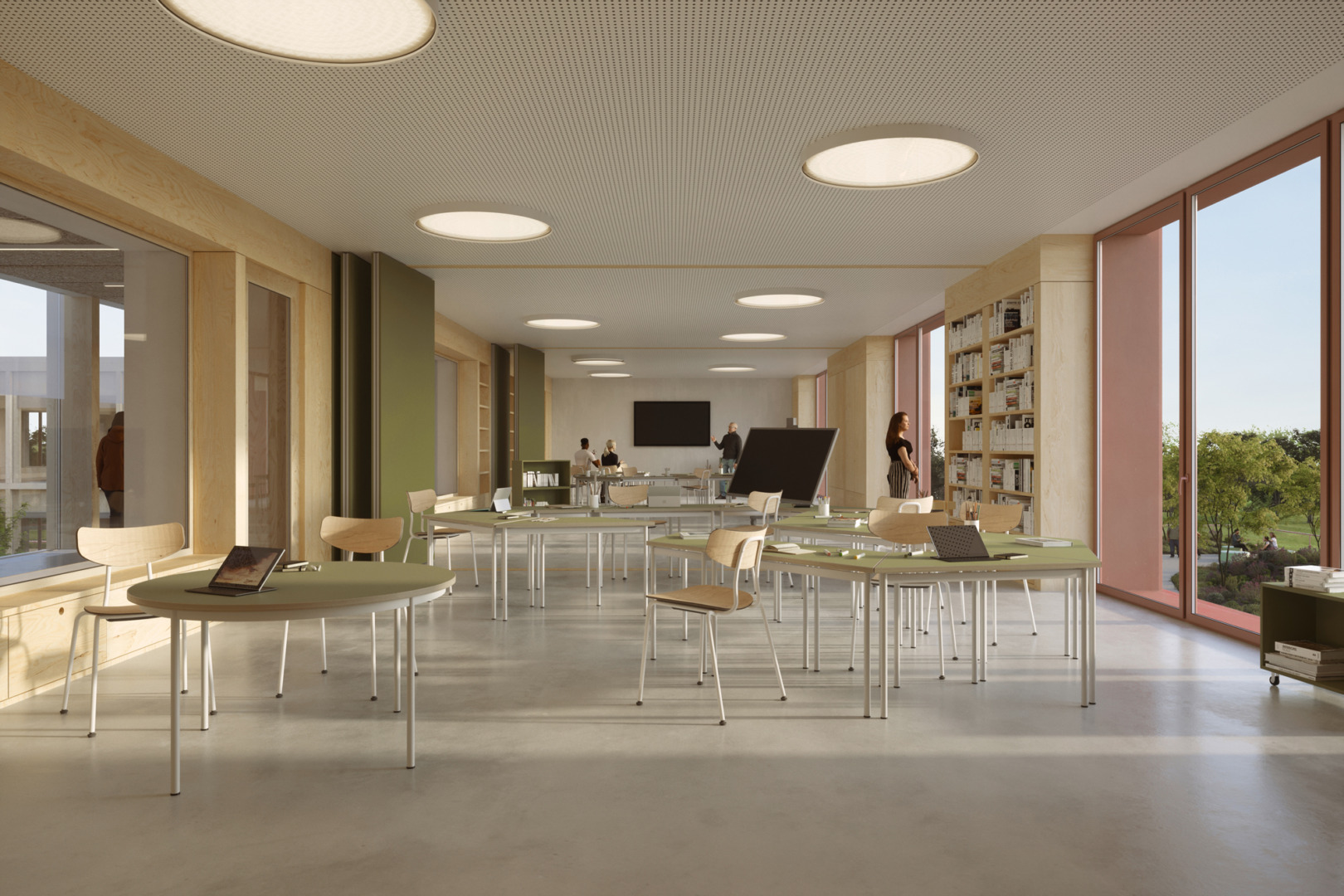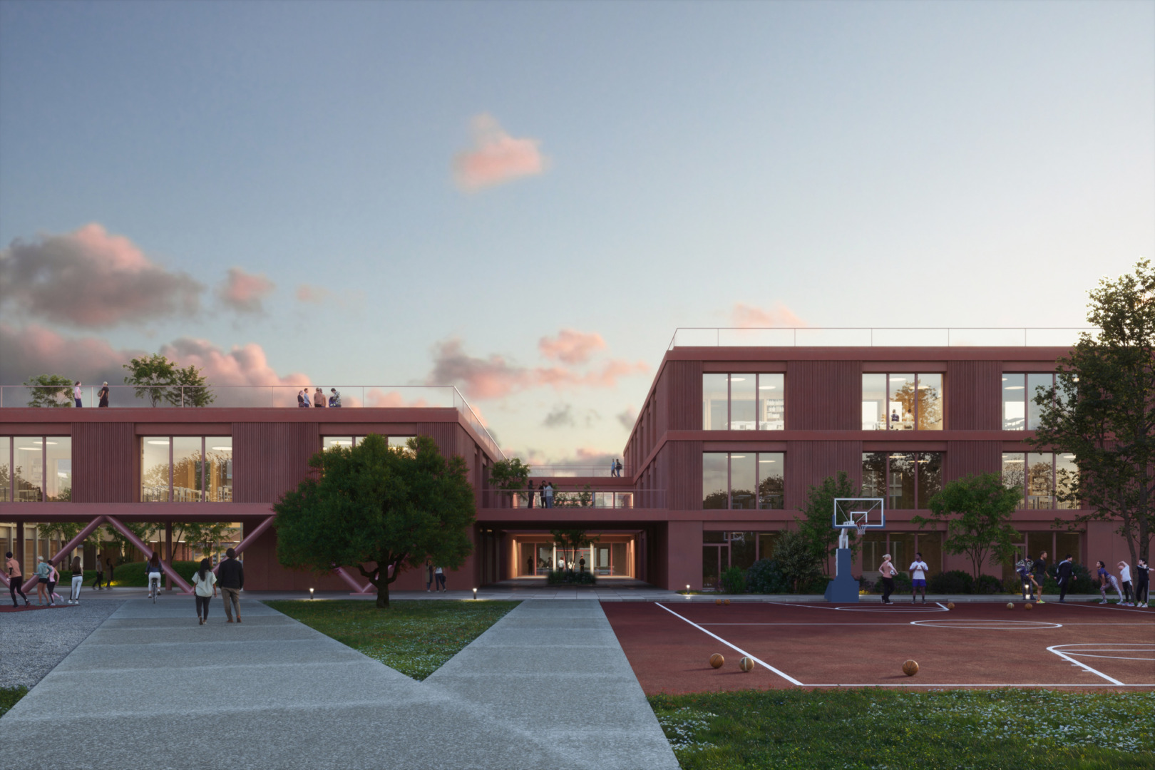 The various roofs of the school are treated with intensive greenery, as a reproduction of the traditional garden on the ground, with a wide choice of vegetation and careful planning of usable spaces. The principle that the new building must contribute to a general reduction of the impact on the environment through the use of materials that are easily disassembled and recyclable at the end of their life, has led to the provision of a structure with load-bearing partitions in CLT combined with point and linear steel elements.