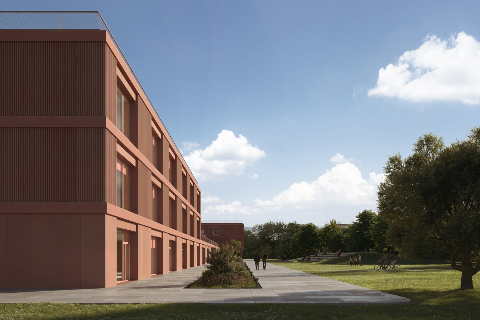 The base, a hinge element between the towers, is characterised externally by a modular scansion of smooth GRC cement cladding panels, whose red colouring evokes the colours of the local earth, rich in iron hydroxides and clay minerals, which helps to give the building a contemporary Mediterranean architectural identity. The upper levels are characterised by a ribbed cladding that accentuates the play of light and shadow. The open façades on the internal courtyards are characterised by large windows framed by a modular scansion of wooden mullions and horizontals, useful for giving a natural appearance to these open-air spaces.