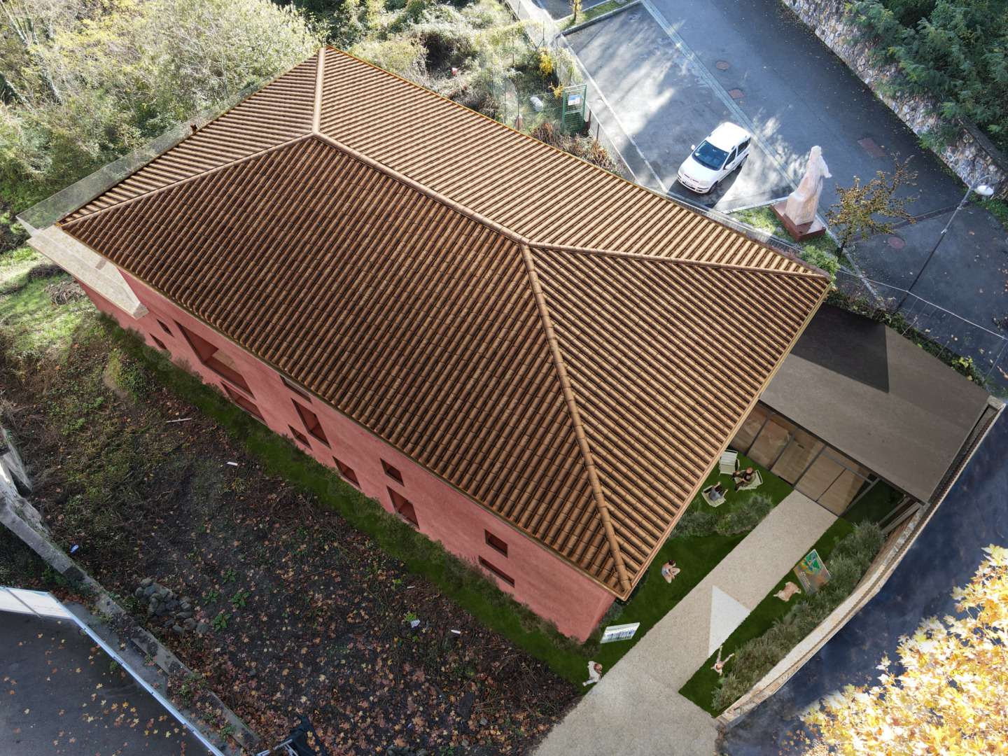▶ Following the principle of recognisability, the insertion of a new volume was planned to fill the residual space between the building and the embankment, aimed at hosting both an accessible entrance route, as well as necessary technical and service volumes. A light and sinuous volume that winds along the façade reaching the terrace on the east side. This acquires both the function of vertical connection and is committed to enriching the architectural value of the southern façade of the building which constitutes the first visual encounter with the Borgo di Castelnuovo for visitors, as well as a perspective element of considerable importance also in relation to the Church and the MINE on the top.