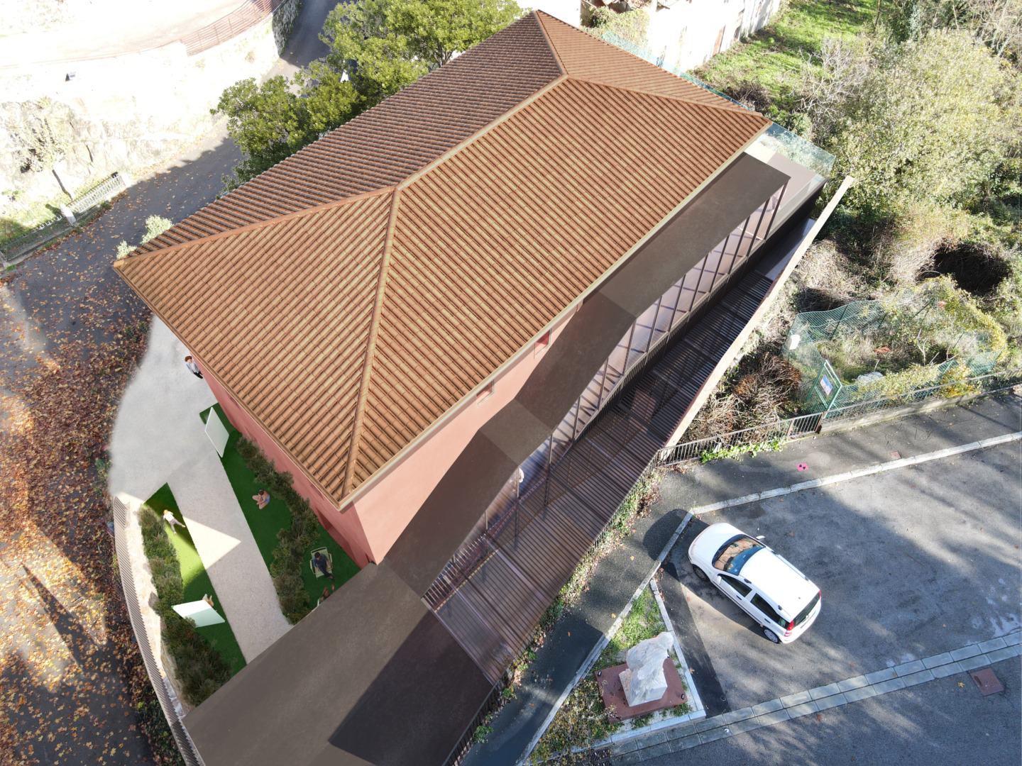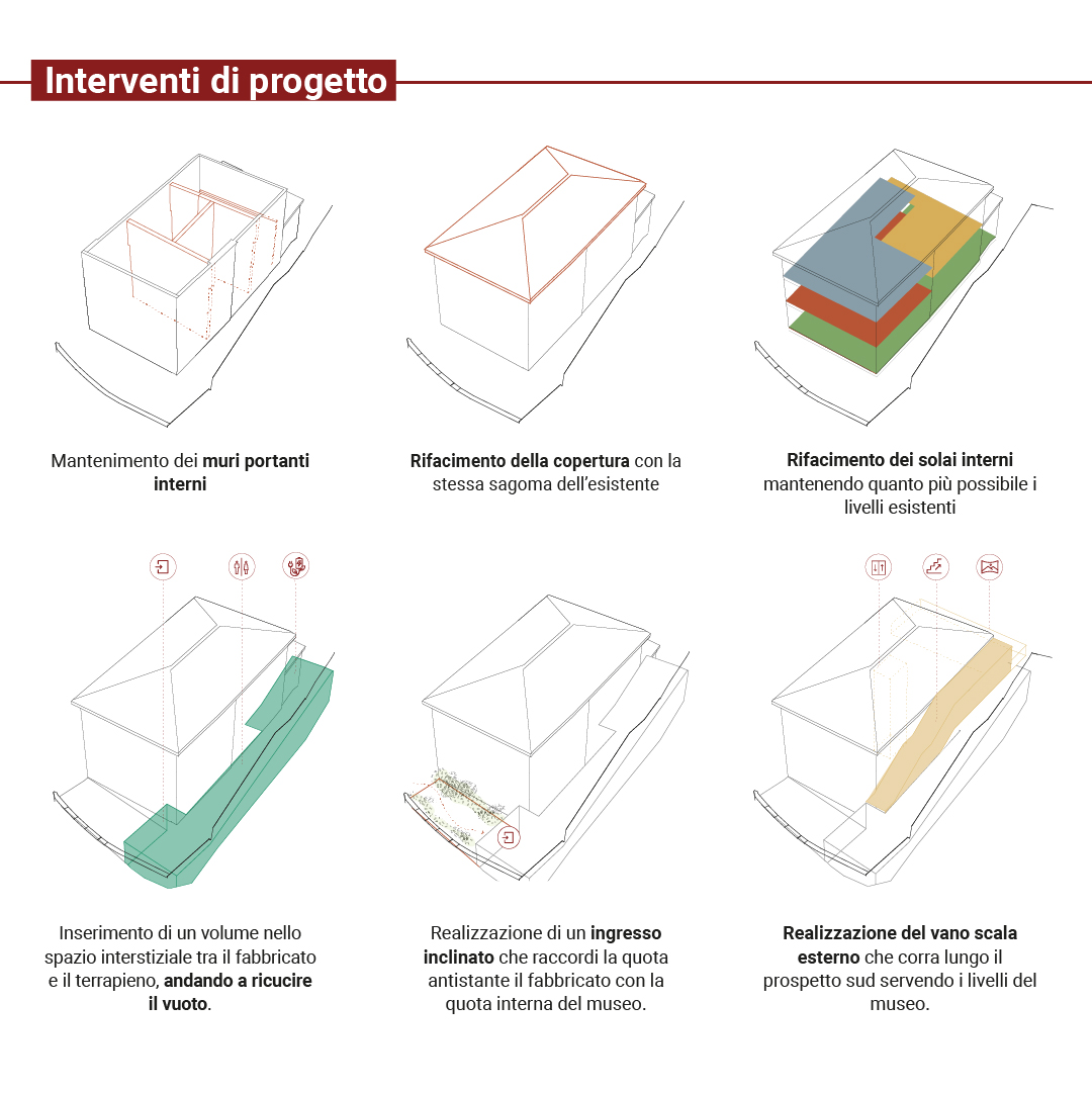 ▶ Seguendo il principio della riconoscibilità, si è prevista l’inserimento di un nuovo volume che colmi lo spazio residuale tra edificio e terrapieno, volto ad ospitare sia un percorso di ingresso accessibile, nonché volumi tecnici e di servizio necessari. Un volume leggero e sinuoso che si snoda lungo il prospetto raggiungendo la terrazza sul lato est. Questo acquisisce sia la funzione di collegamento verticale sia si impegna ad arricchire il valore architettonico del prospetto sud dell’edificio che costituisce il primo incontro visivo con il Borgo di Castelnuovo per i visitatori, nonché elemento prospettico di notevole importanza anche in rapporto con la Chiesa e il MINE sulla sommità.