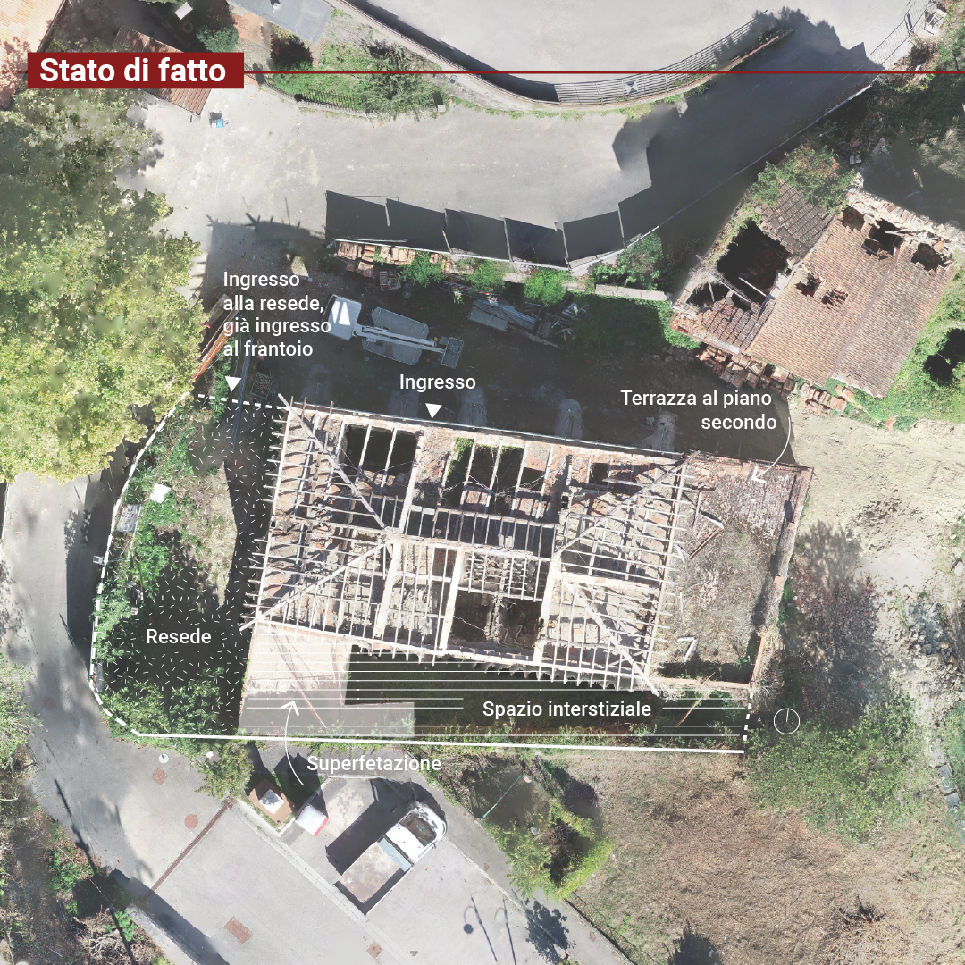 ▶ In primo luogo punta al minimo intervento, lasciando inalterato l’aspetto esteriore del fabbricato e l’impianto strutturale esistente, in cui il sistema resistente è affidato alle murature perimetrali esterne e muri trasversali interni, per poi concedersi una maggiore libertà progettuale per assicurare la fruibilità della struttura in vista della sua nuova destinazione d’uso.